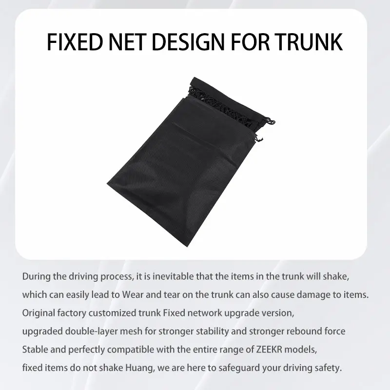 - احصل على تجربة قيادة أكثر ترتيبًا وأمانًا مع الجيب الشبكي لتخزين الأمتعة الخلفية لسيارات ZEEKR 001/X، الحل الذكي الذي يحافظ على أغراضك منظمة ويمنع أي تلف للسيارة أثناء القيادة. تصميم مبتكر يجمع بين المتانة، المرونة، وسهولة الاستخدام لتجعل كل رحلة أكثر راحة وأمانًا.