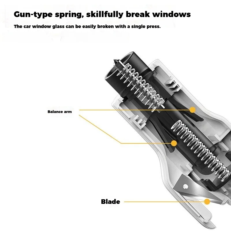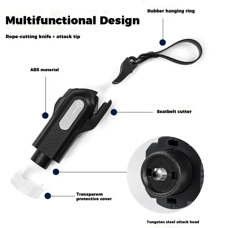 - كسر فوري للنوافذ: مزودة برأس من فولاذ التنجستن مع نظام زنبركي يشبه السلاح، يكسر زجاج السيارة بضغطة واحدة.